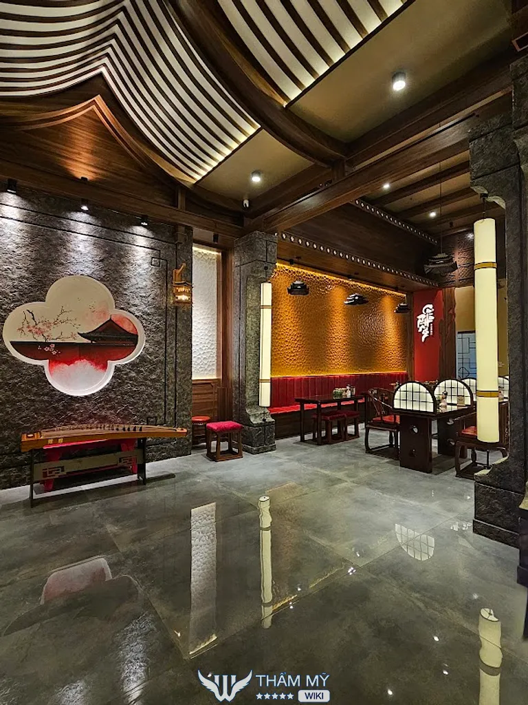 Nhìn vào những bức ảnh thực tế, tòa nhà nổi bật với tông màu tối chủ đạo, điểm xuyết là những khung cửa sổ gỗ song thưa sơn đỏ (một nét đặc trưng của kiến trúc cung đình xưa) và ánh đèn vàng ấm áp hắt ra từ bên trong. Logo hình hạc và mặt trời cách điệu ngay trên bảng hiệu cũng ngầm khẳng định triết lý của thương hiệu: Hướng tới sự trường thọ, an yên và tái sinh năng lượng.