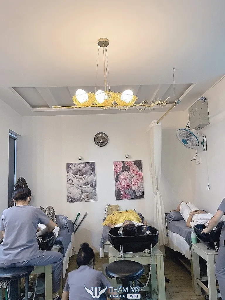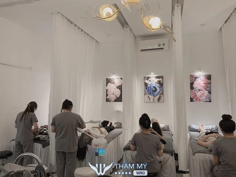 Bên trong, không gian mang phong cách tối giản – hiện đại – sạch sẽ, ánh sáng dịu nhẹ, mùi hương tinh dầu dễ chịu. Khu vực giường trị liệu được ngăn bằng rèm, vừa đảm bảo tính riêng tư vừa tạo cảm giác thoáng đãng. Đây là một điểm cộng lớn, đặc biệt với các dịch vụ massage body, chăm sóc da chuyên sâu hoặc khách đi theo cặp, nhóm bạn.